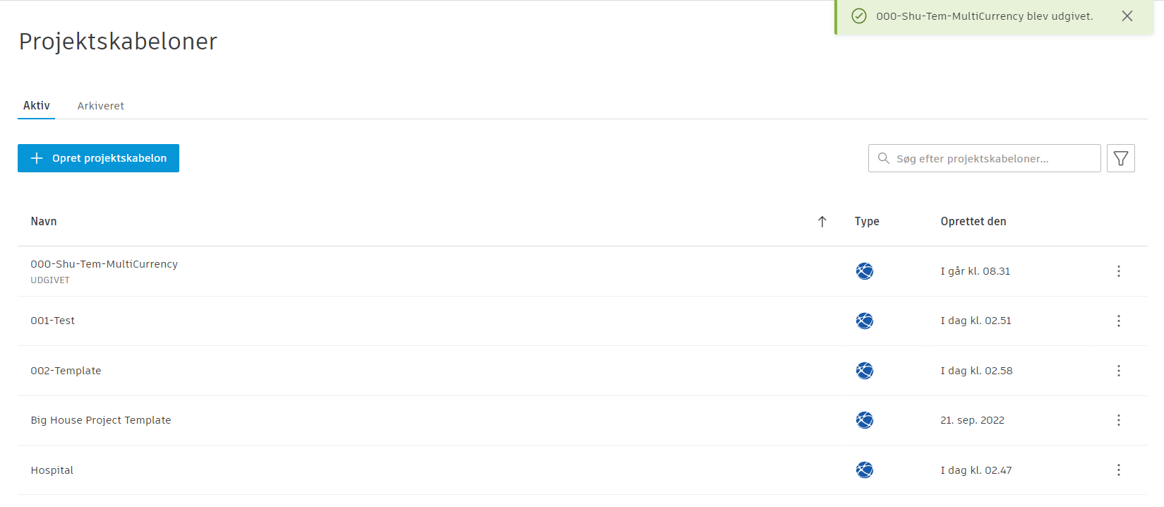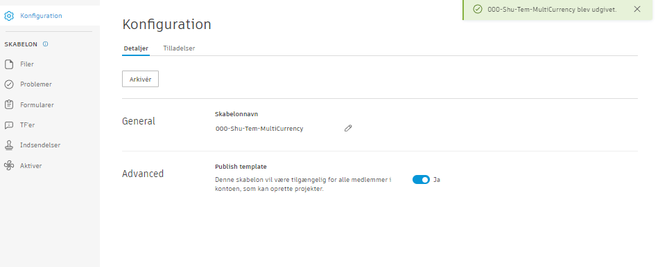 Herefter vises der en besked om, at din projektskabelon er udgivet.