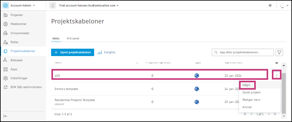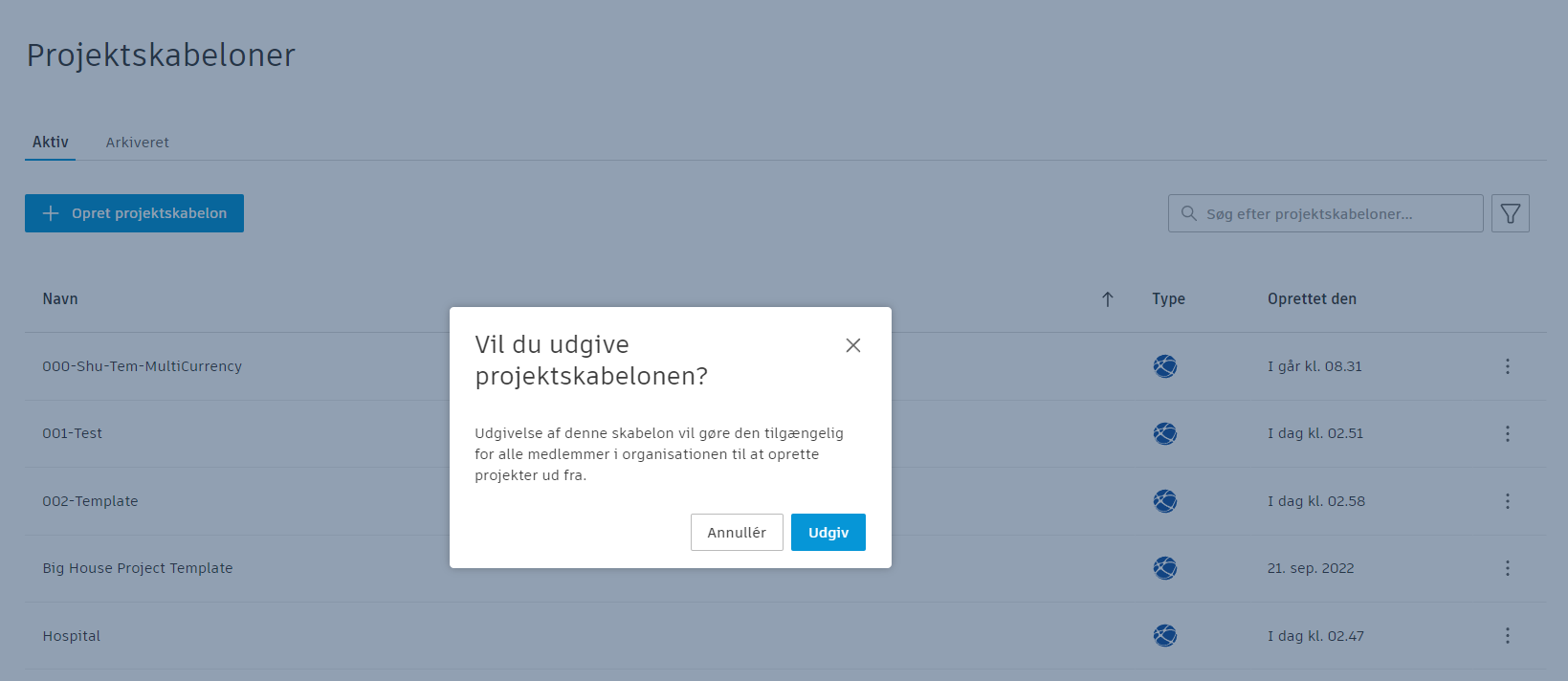 Klik på de tre prikker på den pågældende projektskabelonsrække, og vælg Udgiv.
