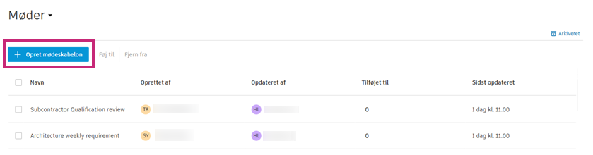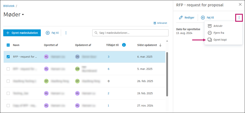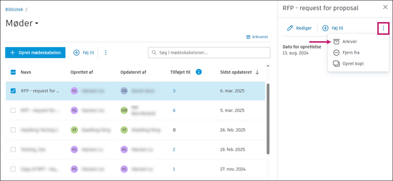 øverst i tabellen og vælge ArkivérVed at oprette en kopi af en mødeskabelon kan du senere hurtigt oprette nye skabeloner til forskellige projekter eller formål.