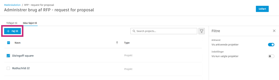 Når du har valgt et eller flere projekter, skal du klikke på Føj til for at tilføje en eller flere skabeloner.