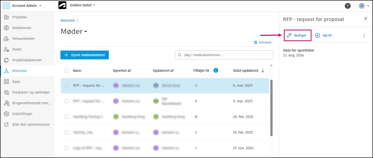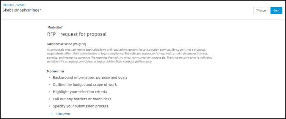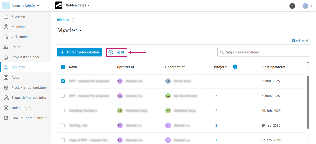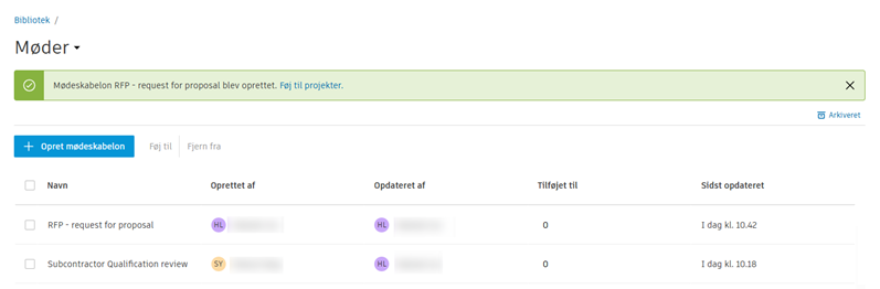 Kontoadministratorer og standardadministratorer kan oprette mødeskabeloner i Bibliotek for deres konto og føje dem til projekter.