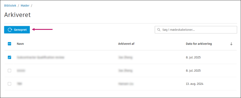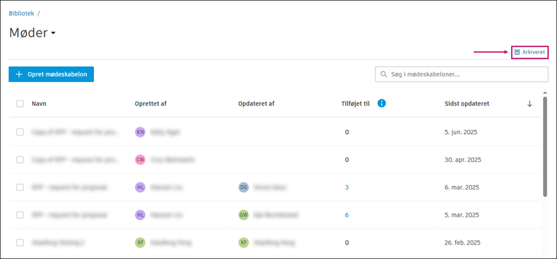 Du kan arkivere og gendanne mødeskabeloner.