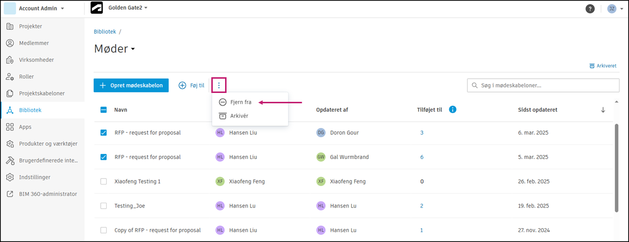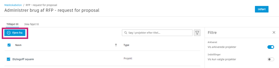 Når du har valgt et eller flere projekter, skal du klikke på Fjern fra for at fjerne en eller flere skabeloner.