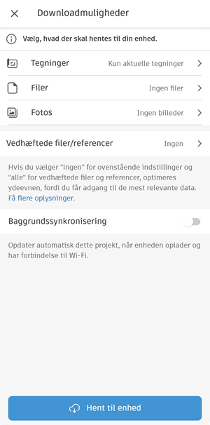 Fildownloadmuligheder er kun tilgængelige ved første download af et projekt på din enhed.