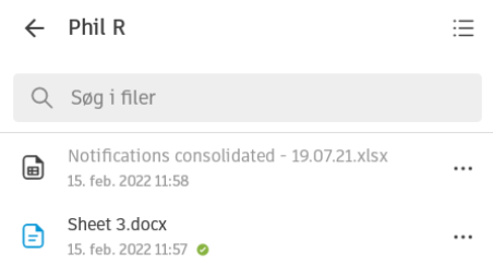 Der vises et grønt fluebensikon ud for en downloadet fil og ud for en mappe, hvor alle de indeholdte filer er downloadet. På billedet nedenfor er Sheet3.docx downloadet og klar til visning. Den anden fil er nedtonet, fordi den ikke er downloadet og derfor ikke kan ses.
