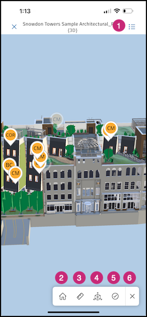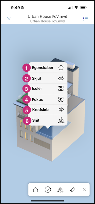 Visningsindstillinger: Tryk på et objekt i modellen for at få yderligere visningsindstillinger. Følgende tal svarer til tallene i dette skærmbillede.