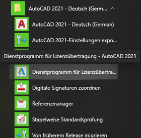- Windows. Suchen Sie die LTU-Verknüpfung im Startmenü, in demselben Ordner wie das Autodesk-Produkt, das Sie übertragen möchten.