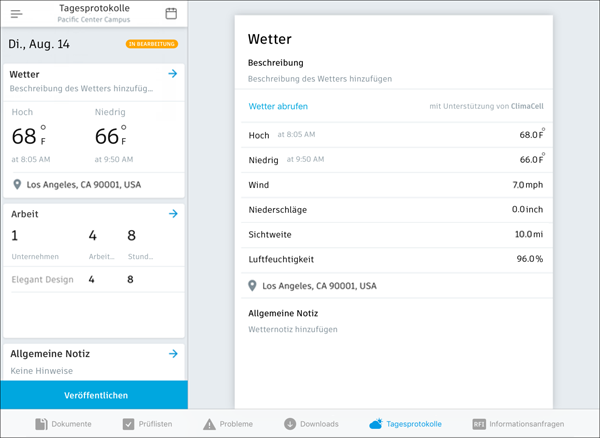 Sie können dem Bautagebuch Wetterbedingungen, Personalkennzahlen und Anmerkungen zu täglichen Protokollen hinzufügen. Tägliche Protokolle anzeigen und aktualisieren, nach Bedarf. Weitere Informationen zu den Funktionen der täglichen Protokolle der iOS-App finden Sie unter BIM 360-Mobil-Funktionen.