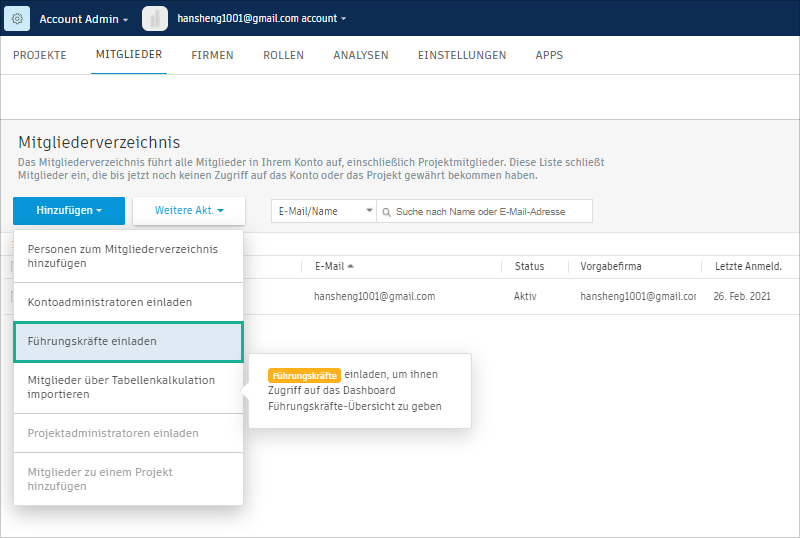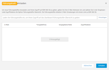 Geben Sie im Dialogfeld Führungskräfte einladen eine E-Mail-Adresse ein, und klicken Sie auf Hinzufügen.
