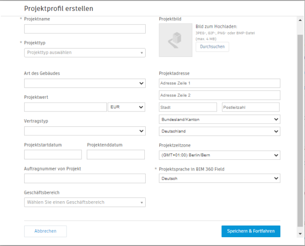 Geben Sie im Dialogfeld Projektprofil erstellen den Projektnamen und die Projektinformationen ein. Erforderliche Felder sind mit einem Sternchen gekennzeichnet. Manche der Felder, wie zum Beispiel die Start- und Enddaten, werden für Berichte und Analysen zu Firmen genutzt, um sicherzustellen, dass alle Teammitglieder Zugang zu einheitlichen Projektinformationen in allen Arbeitsabläufen haben.