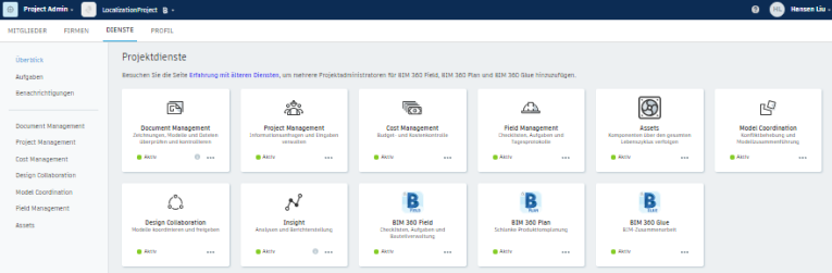 Klicken Sie im Modul Project Admin auf die Registerkarte Dienste.