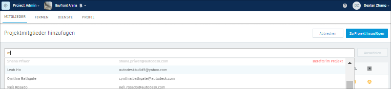 Beginnen Sie im Feld Projektmitglieder hinzufügen mit der Eingabe des Namens eines Mitglieds, wenn diese Person bereits im Konto vorhanden ist.