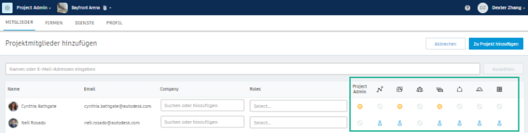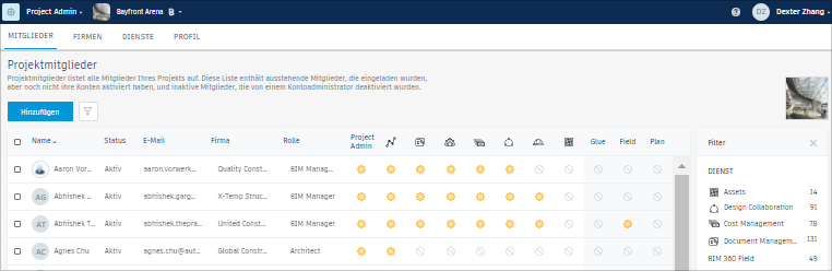Die Registerkarte Mitglieder wird geöffnet und zeigt alle Mitglieder des ausgewählten Projekts, ihre zugewiesenen Rollen und Firmen und die Dienste oder Module an, auf die sie Zugriff haben.