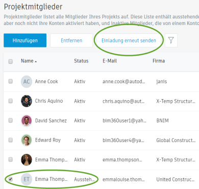 Aktivieren Sie das Kontrollkästchen neben dem Namen eines oder mehrerer Mitglieder, die in der Spalte Status als Ausstehend angezeigt werden. Die Option Einladung erneut senden wird neben den Funktionen Hinzufügen und Entfernen angezeigt.