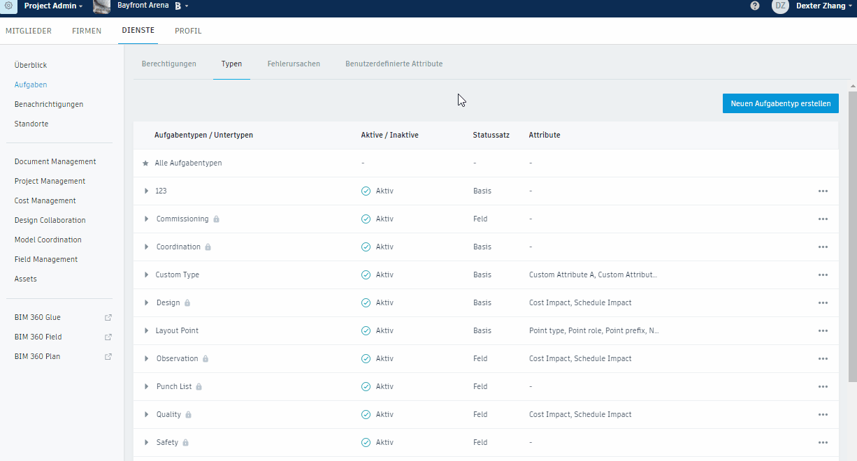 Nur Projektadministratoren können Aufgabentypen oder Untertypen erstellen.