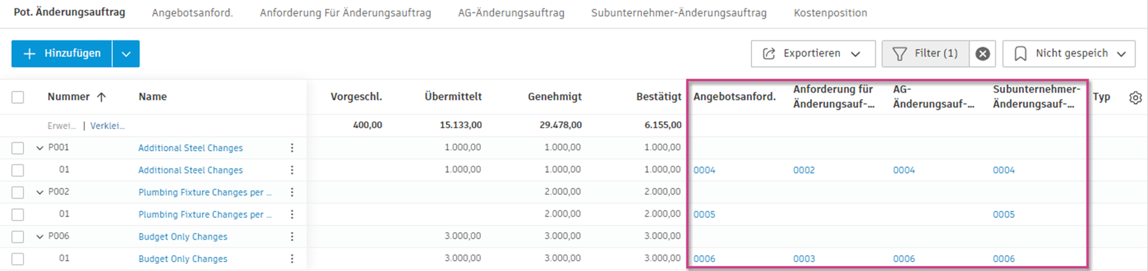 Sie erkennen die Quelle und die Beziehung zwischen verschiedenen Änderungsauftragstypen