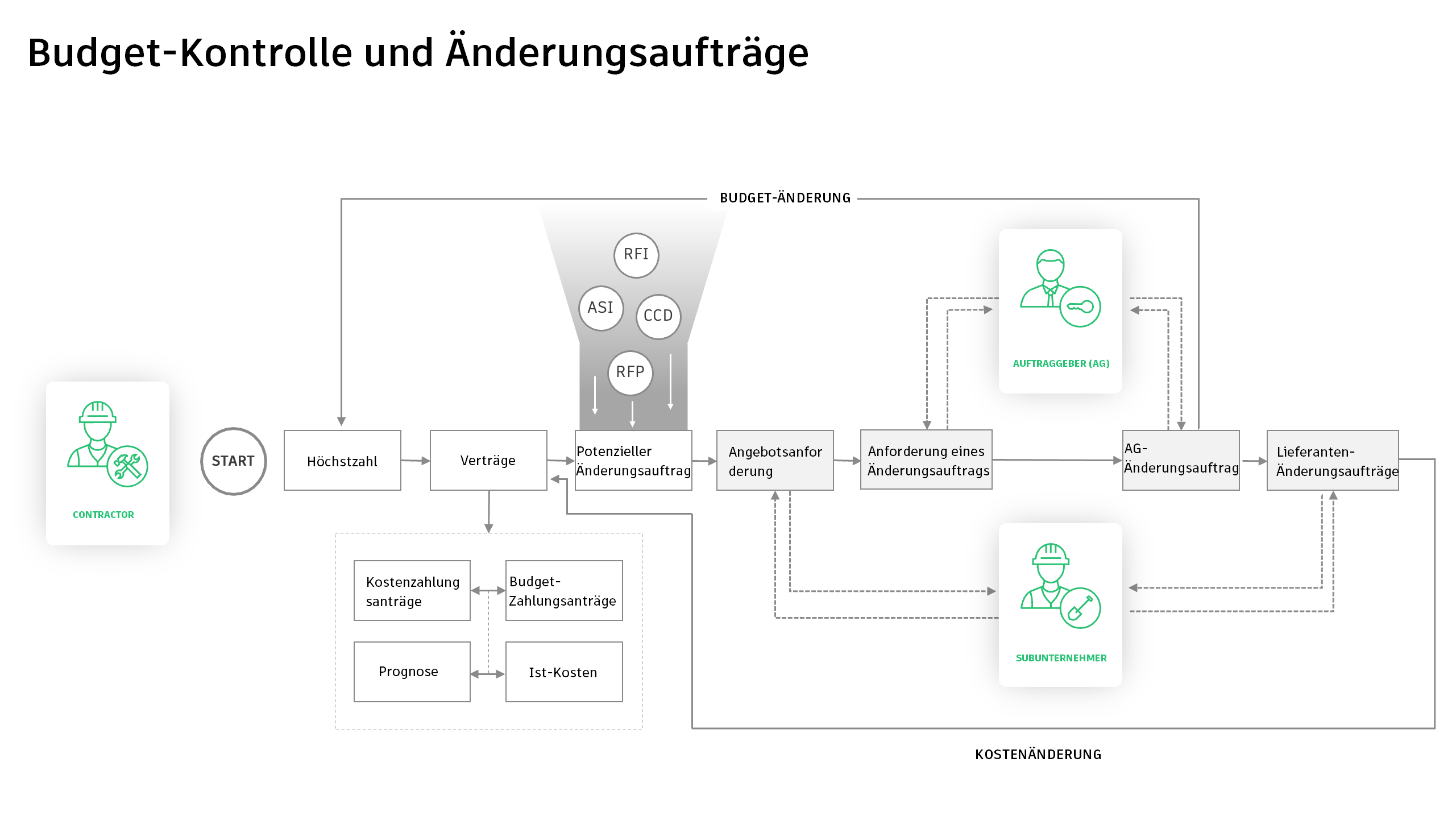 Eine Anforderung für Änderungsauftrag kann zum Erstellen von AG-Änderungsaufträgen oder Subunternehmer-Änderungsaufträgen verwendet werden.