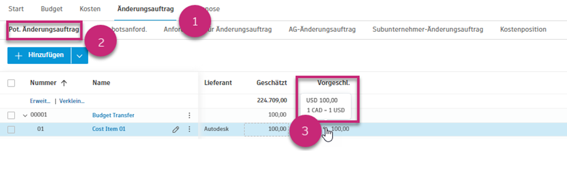 Anzeigen von Änderungsaufträgen in einer Basiswährung basierend auf definierten Wechselkursen
