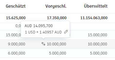 Die Werte für Geschätzt, Übermittelt und Genehmigt werden immer in der Basiswährung eingegeben. Dennoch werden Sie Veränderungen bei den Werten Vorgeschl. und Bestätigt feststellen. Neben der Basiswährung wird das Symbol angezeigt. Bewegen Sie den Mauszeiger darüber, um den Wechselkurs anzuzeigen oder zu bearbeiten: