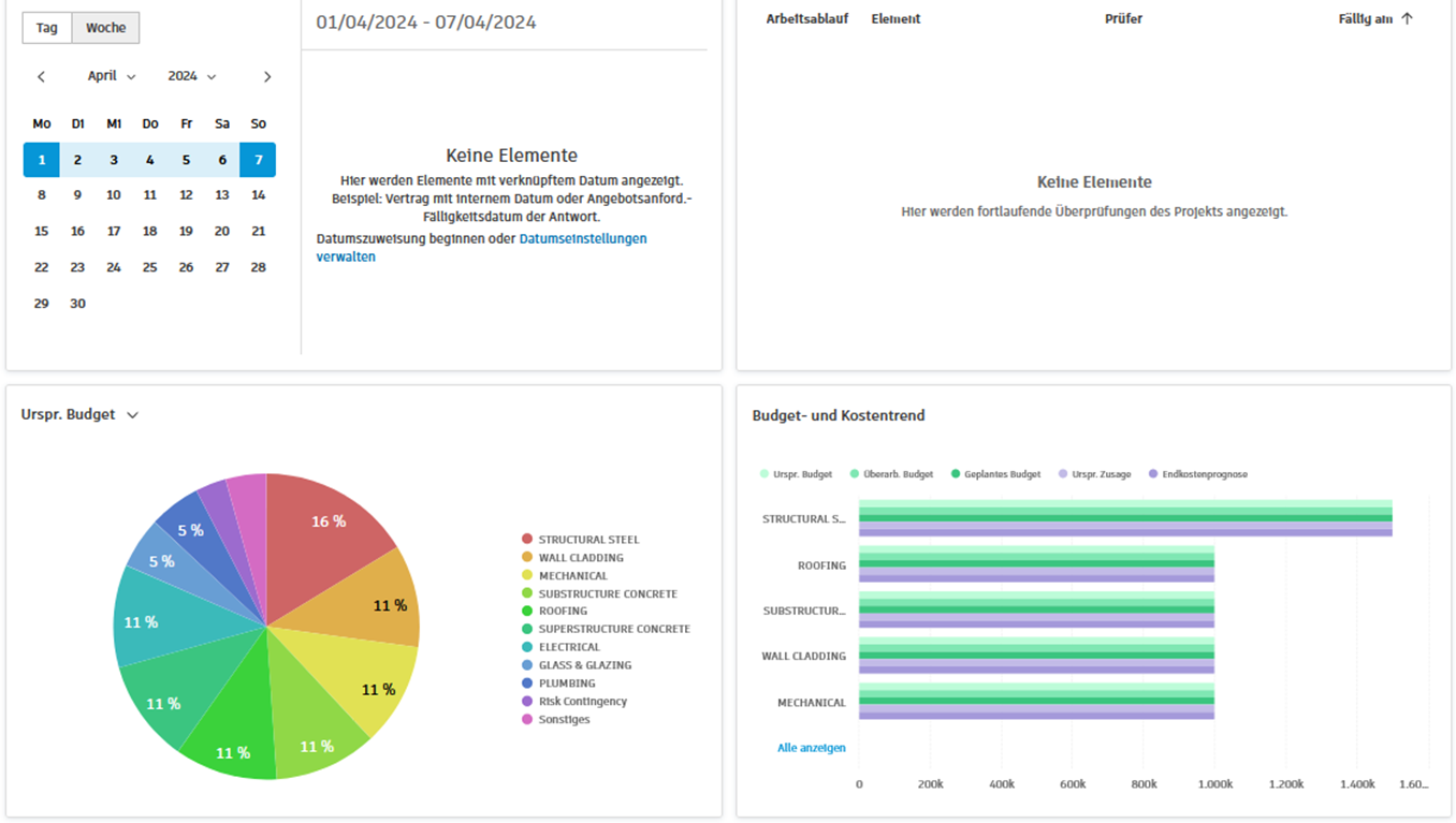 Wenn Sie ein Projekt in Cost Management öffnen, wird die Startseite angezeigt.