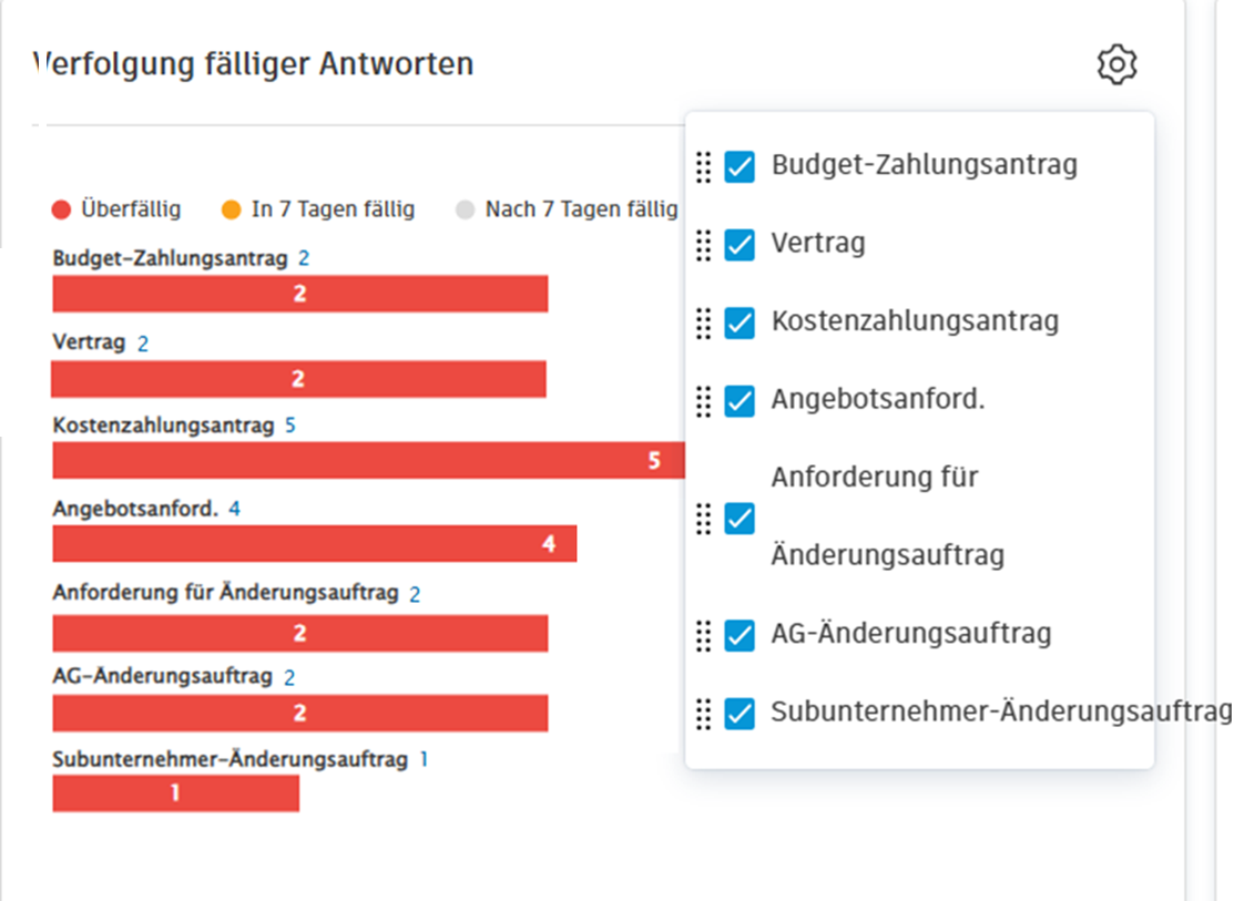 Das Menü zeigt alle Registerkarten mit Elementen mit dem Attribut Antwort fällig an. Mitglieder können Menüelemente auswählen oder die Auswahl aufheben, um die Anzeige der entsprechenden Balkendiagramme umzuschalten.