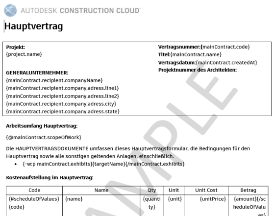 Wählen Sie Beispieldokument herunterladen aus, um eine anpassbare Word- oder Excel-Vorlage herunterzuladen. Sie können in einer Microsoft Word-Datei arbeiten und Variablen zu Ihrer eigenen Datei hinzufügen. Erfahren Sie mehr über die Variablen, die für Dokumente verfügbar sind.