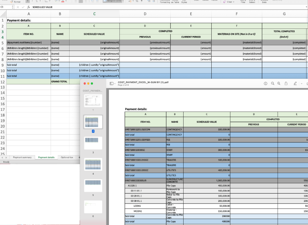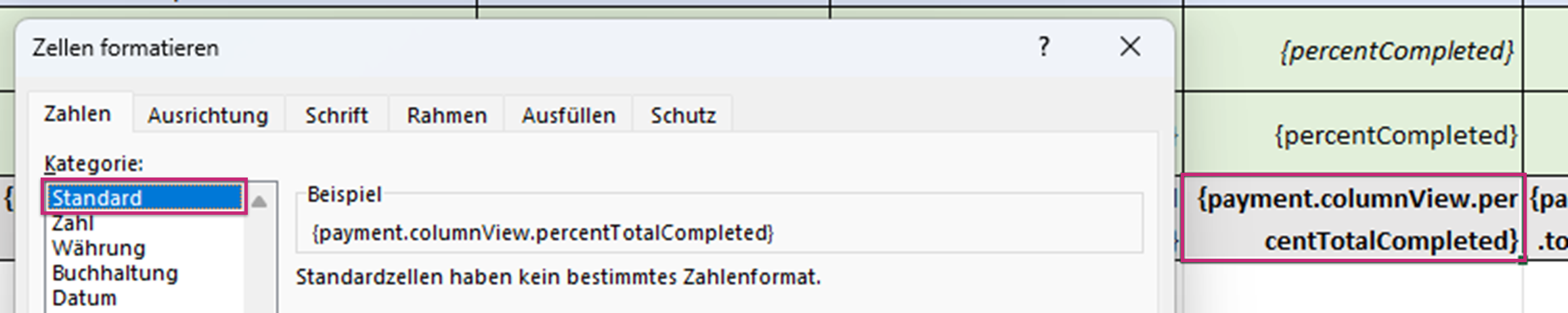 %-Zeichen hinzufügen möchten, formatieren Sie die Zelle als allgemeinen Typ und fügen der Zelle manuell das % hinzu, z. B. {payment.columnView.percentTotalCompleted}%. Die Formel eignet sich nur für den Spaltenmodus Kostenzahlungsantrag.Administratoren können Zellen im nativen Excel-Prozentformat verwenden, indem sie selbst eine Prozentformel definieren. Beispiel: Für die Spalte mit dem Prozentsatz der insgesamt abgeschlossenen Arbeiten eines Kostenzahlungsantrags lautet die benutzerdefinierte Formel {completed | divide: revisedValue}.