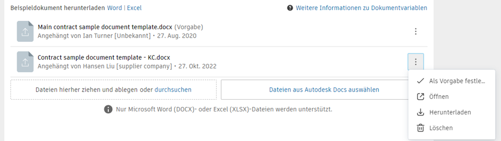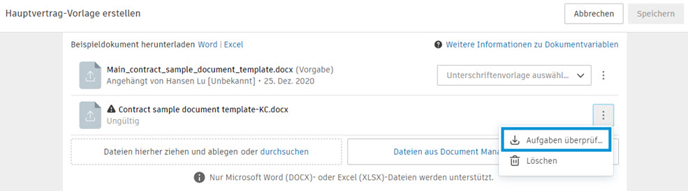 Während der Erstellung von Dokumentvorlagen können Sie eine Beispieldokumentvorlage herunterladen und bearbeiten. Wählen Sie dazu Word oder Excel aus, um eine anpassbare Word- oder Excel-Datei herunterzuladen.