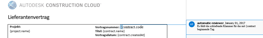 Die Dokumentvorlage wird heruntergeladen. Öffnen Sie die heruntergeladene Dokumentvorlage. Neben ungültigen Variablen werden die Kommentare angezeigt.