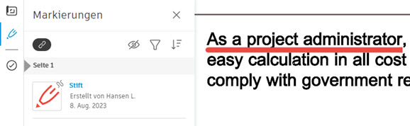 Sie können einem PDF-Dokument Markierungen hinzufügen. Dies kann beispielsweise während der Prüfung des Genehmigungsablaufs hilfreich sein.