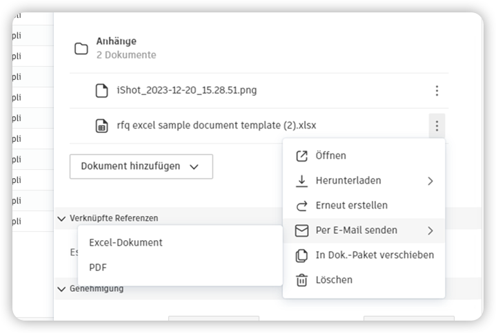 Nachdem Sie Dokumente zum Dokumentpaket hinzugefügt haben, können Sie sie auf verschiedene Weise verwalten, bevor Sie eine E-Mail an den Auftraggeber oder Lieferanten senden.