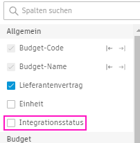 Durch Hinzufügen der Spalte Integrationsstatus zu den Tabellenansichten der Registerkarten Budget, Kosten und Änderungsauftrag können Sie sehen, welche Elemente, Abschnitte und Aktionen gesperrt und integriert sind.