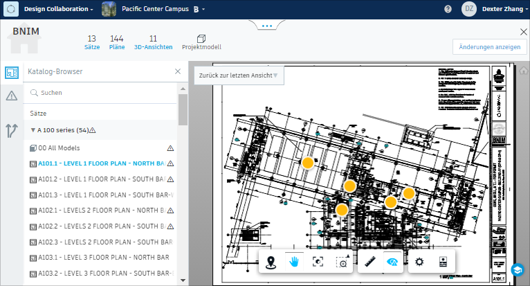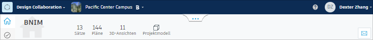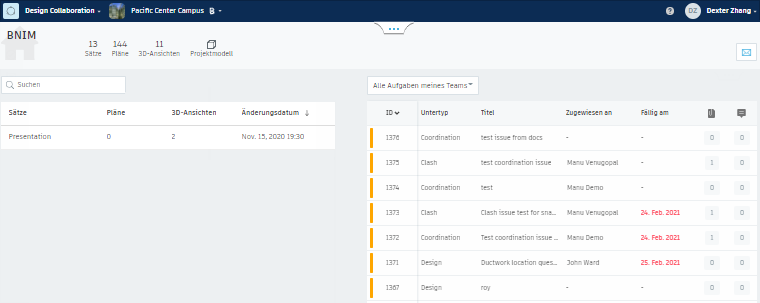 Der Teambereich ist Ihr Startportal im Modul Design Collaboration. Er bietet eine aktuelle Ansicht des jeweiligen Modellzustands. Beim ersten Aufrufen des Moduls sehen Sie die Liste der neuesten Sätze, Pläne, Ansichten und Modelle, die Ihr Team in BIM 360 publiziert hat. Sie können auch E-Mail-Benachrichtigungen steuern und den Projektstatus anzeigen.