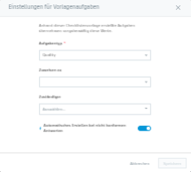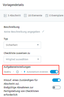 Aktivieren Sie die automatische Erstellung von Mängeln, indem Sie die Option im Abschnitt mit den Vorlagendetails während der Vorlagenerstellung aktivieren. Klicken Sie auf das Zahnradsymbol, um die Einstellungen für die automatische Erstellung von Mängeln zu konfigurieren.