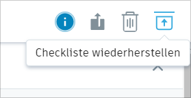 Sie können archivierte Checklisten mithilfe eines Filters suchen. Um eine Checkliste wiederherzustellen, öffnen Sie sie und klicken auf das Symbol Wiederherstellen in der oberen rechten Ecke. Bestätigen Sie die Aktion. Die Checklisten werden wiederhergestellt.