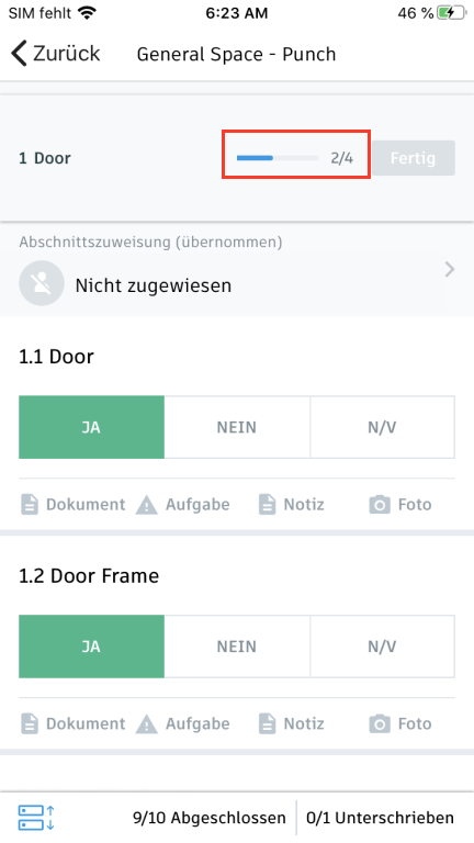 Beim Ausfüllen eines Checklisten-Abschnitts wird oben im Abschnitt eine Fortschrittsleiste angezeigt. Das Ausfüllen von Abschnitten trägt zum Fortschritt der Fortschrittsanzeige bei.