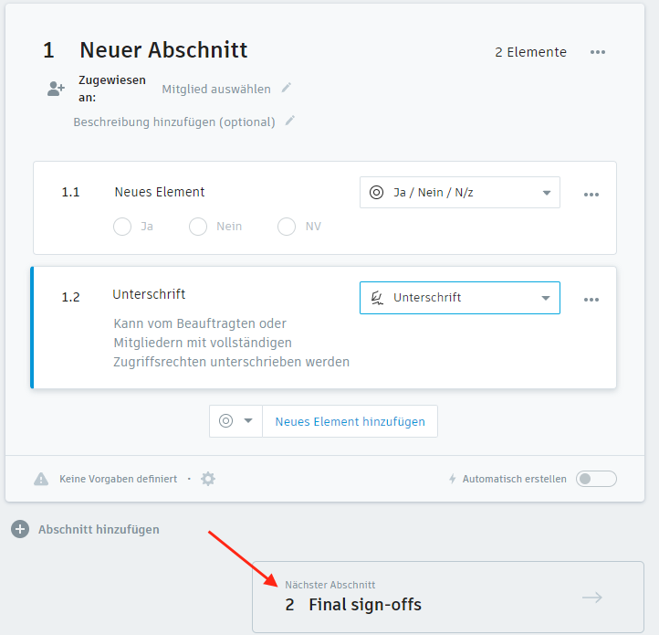 Ein Abschnitt kann erst als abgeschlossen markiert werden, wenn alle erforderlichen Elemente ausgefüllt sind.