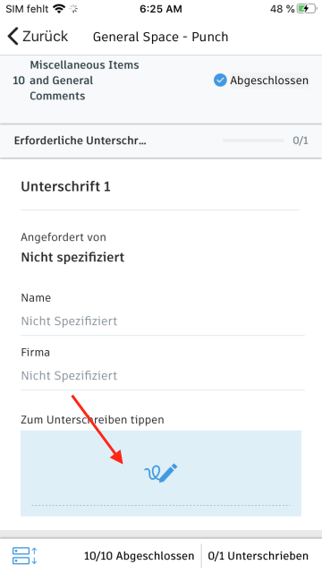 Damit die Checkliste oder einer ihrer Abschnitte erneut geöffnet werden kann, müssen die endgültigen Abnahmen gelöscht werden. Tippen Sie auf das Papierkorbsymbol im Feld für die fertige Unterschrift, um die endgültige Abnahme zu löschen.