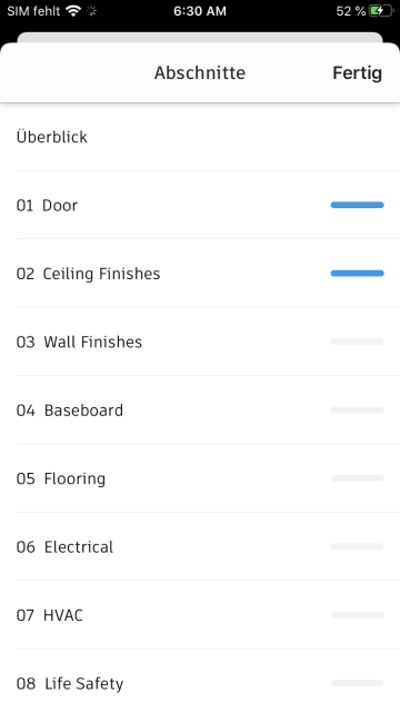 Um den Gesamtfortschritt aller Abschnitte in einer Checkliste auf einem Mobilgerät anzuzeigen, tippen Sie auf das Abschnittssymbol im unteren Werkzeugkasten.
