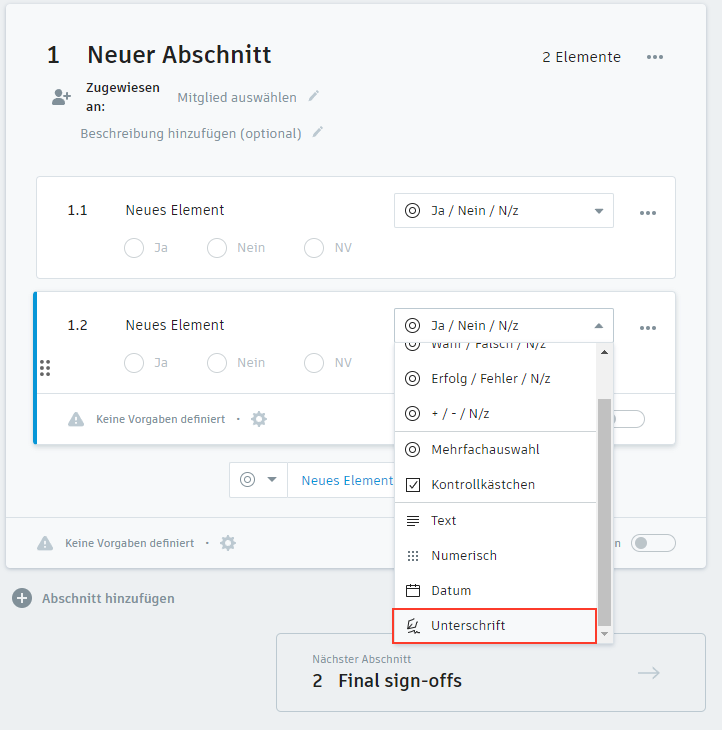 Sie können Abschnittsunterschriften zu einem Checklistenabschnitt hinzufügen, während Sie eine Checklistenvorlage einrichten. Abschnittssignaturen werden im Abschnitt als Elemente behandelt.