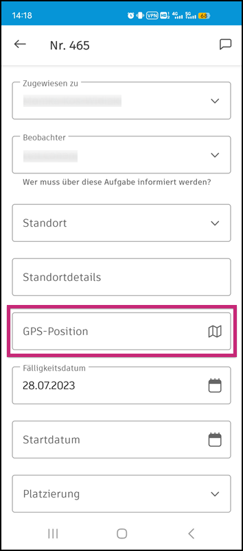 Sie können eine GPS-Position hinzufügen, wenn Sie eine Aufgabe erstellen oder bearbeiten.