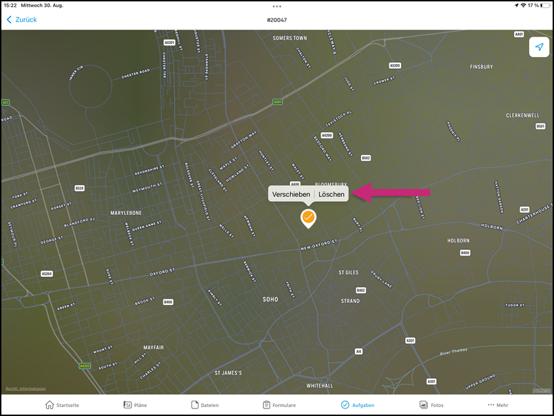 b. Tippen Sie auf den Aufgaben-Pin und dann im Menü auf Verschieben oder Löschen.