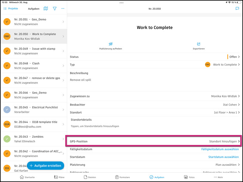 In der Autodesk Construction Cloud Mobile-App können Sie GPS-Koordinaten zu Aufgaben hinzufügen, damit Ihr Team die Position der Aufgaben in Ihrem Projekt besser versteht. Wenn Koordinaten hinzugefügt wurden, kann Ihr Team auch eine Karte aller Aufgaben im Internet anzeigen.