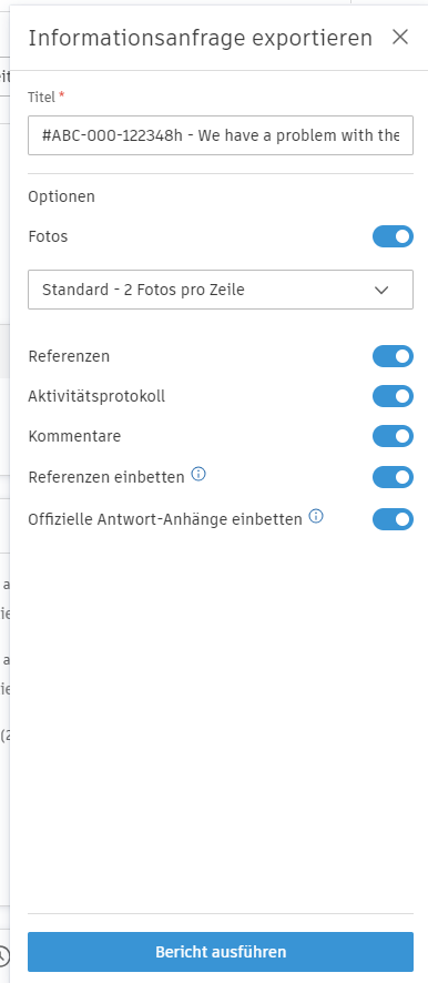 Das Exportieren von Informationsanfragen ermöglicht die Erstellung umfassender Berichte, die als wichtige Dokumentation für ein Projekt dienen. Diese Berichte können so angepasst werden, dass sie einzelne Informationsanfragen im PDF-Format enthalten oder alle Informationsanfragen im PDF- oder XLSX-Format umfassen.