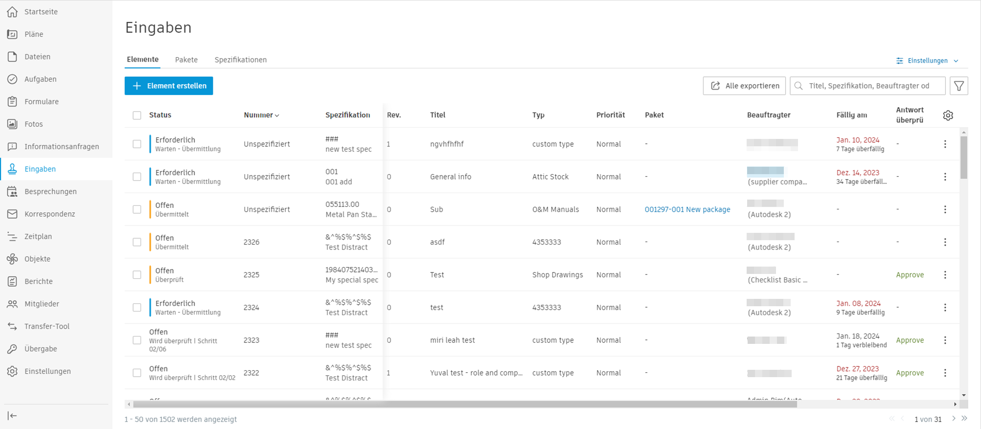 Eingaben sind ein formaler Prozess, bei dem Dokumente, Materialien und Ausstattung von Architekten, Ingenieuren, Kunden oder anderen an einem Bauprojekt beteiligten Personen zur Genehmigung eingereicht werden. Mithilfe des Werkzeugs Eingaben in Autodesk Build können Teams sicherstellen, dass die in Projekten verwendeten Materialien und Ausstattungen den Spezifikationen und Anforderungen entsprechen. Das Werkzeug ist sowohl über Webbrowser als auch über mobile Geräte verfügbar.