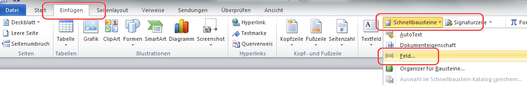 Um ein neues MergeField einzufügen, verwenden Sie die Multifunktionsleiste Einfügen, und wählen Sie Schnellbausteine und Feld: