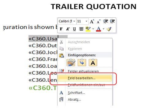 Wenn Sie den Parameternamen oder das Datumsformat in einem MergeField ändern möchten, klicken Sie nicht auf den Text, sondern bearbeiten Sie ihn direkt. Klicken Sie mit der rechten Maustaste auf das Feld, und wählen Sie Feld bearbeiten: