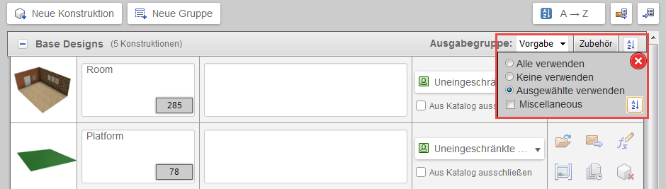 aus der Konstruktionsgruppe aus, und wählen Sie aus dem Menü eine bestimmte Gruppe von Zubehör für Ihre Konstruktion aus.