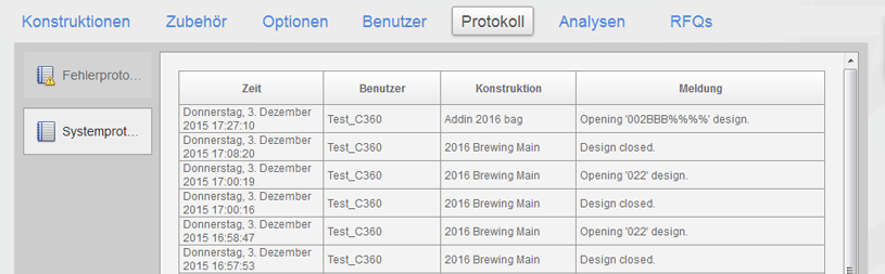 Listet die Aktionen aller Kunden auf, die mit Ihren Konstruktionen interagieren. Sie können Fehler, Uploads und Downloads anzeigen.