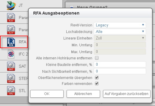 - Revit-Version: Legacy ist die vorherige Version von Revit, die Kompatibilität mit Revit-Benutzern bietet, die noch nicht auf die neueste Version von Revit aktualisiert haben. Diese Option wird nur für die RFA-Ausgabe unterstützt.